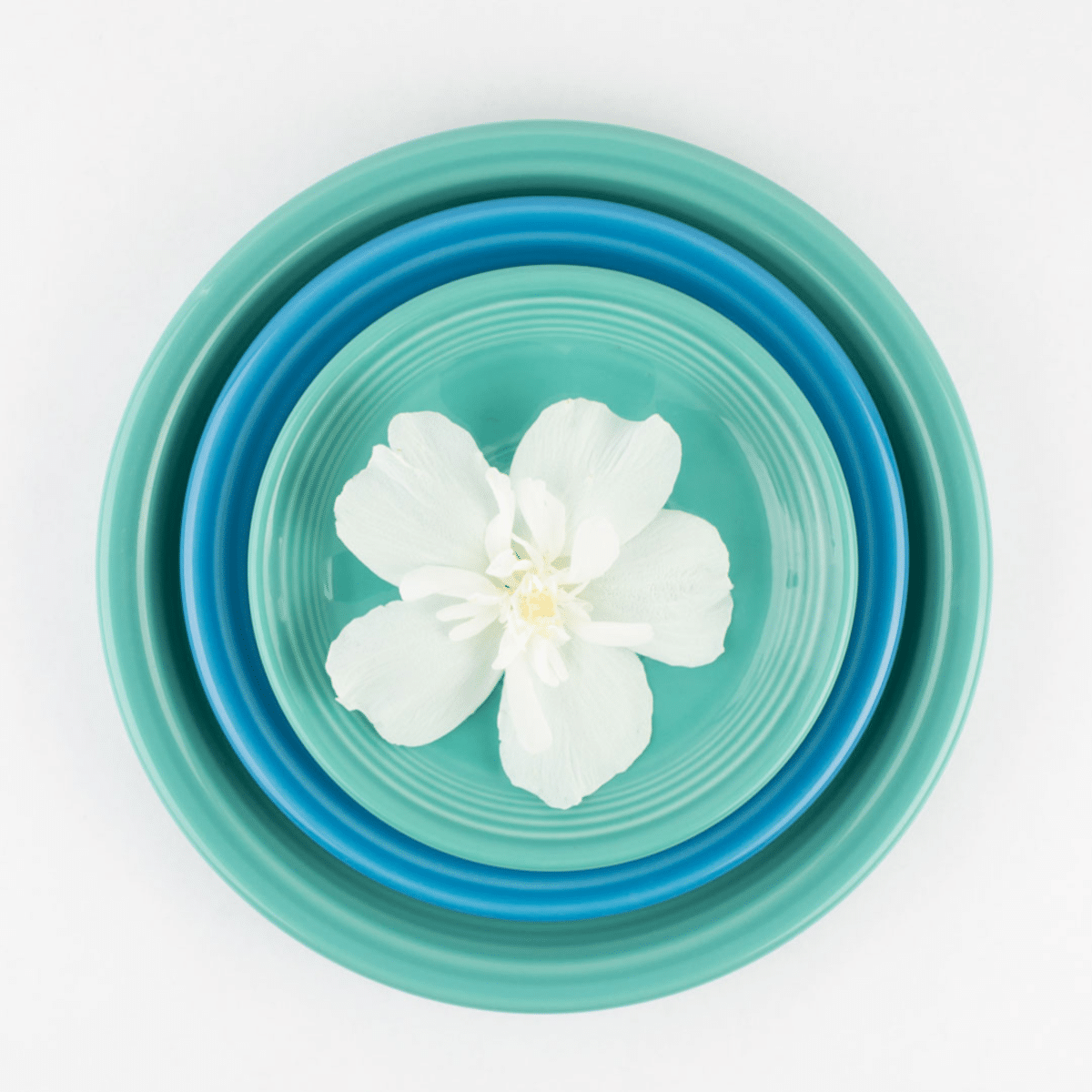 - Borrowed Fiesta ware plates in shades of turquoise and lapis